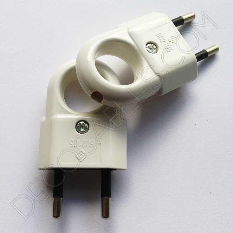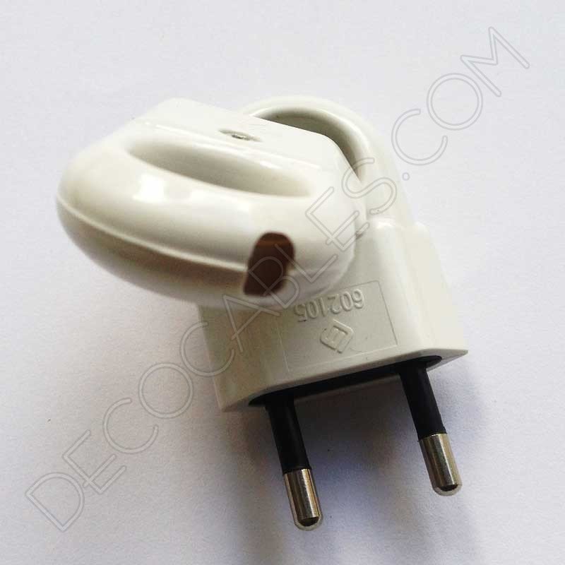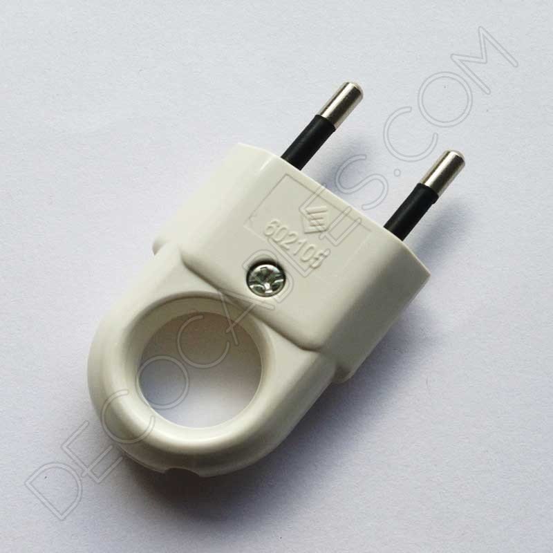 Clavija bipolar macho blanca con anilla de agarre. Esta clavija facilita la desconexión del enchufe mediante la anilla de agarre incorporada.