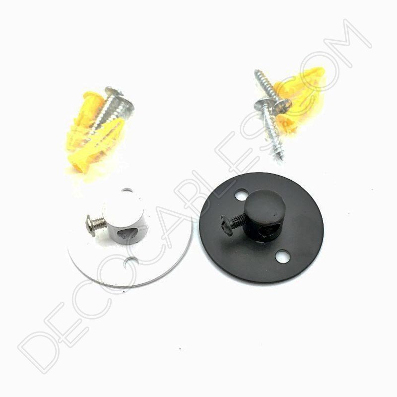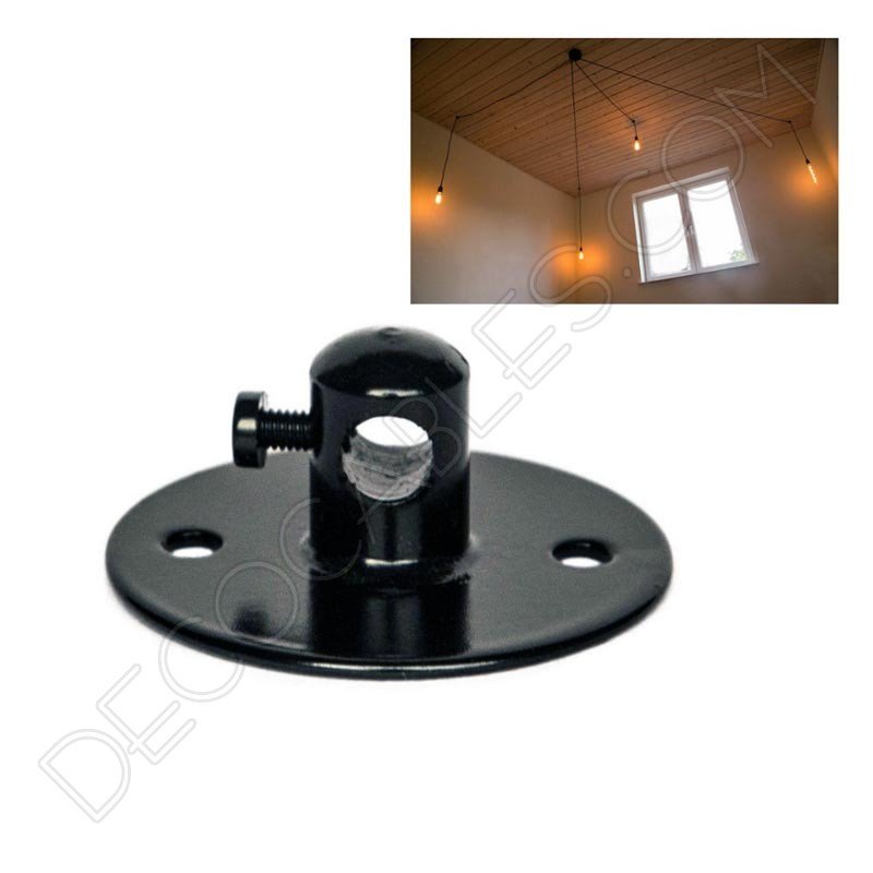 Sujeción metálica de techo para cable indicada especialmente para lámparas araña. Disponible en blanco o negro. Ideal para crear lámparas de araña con cable de tela de colores.